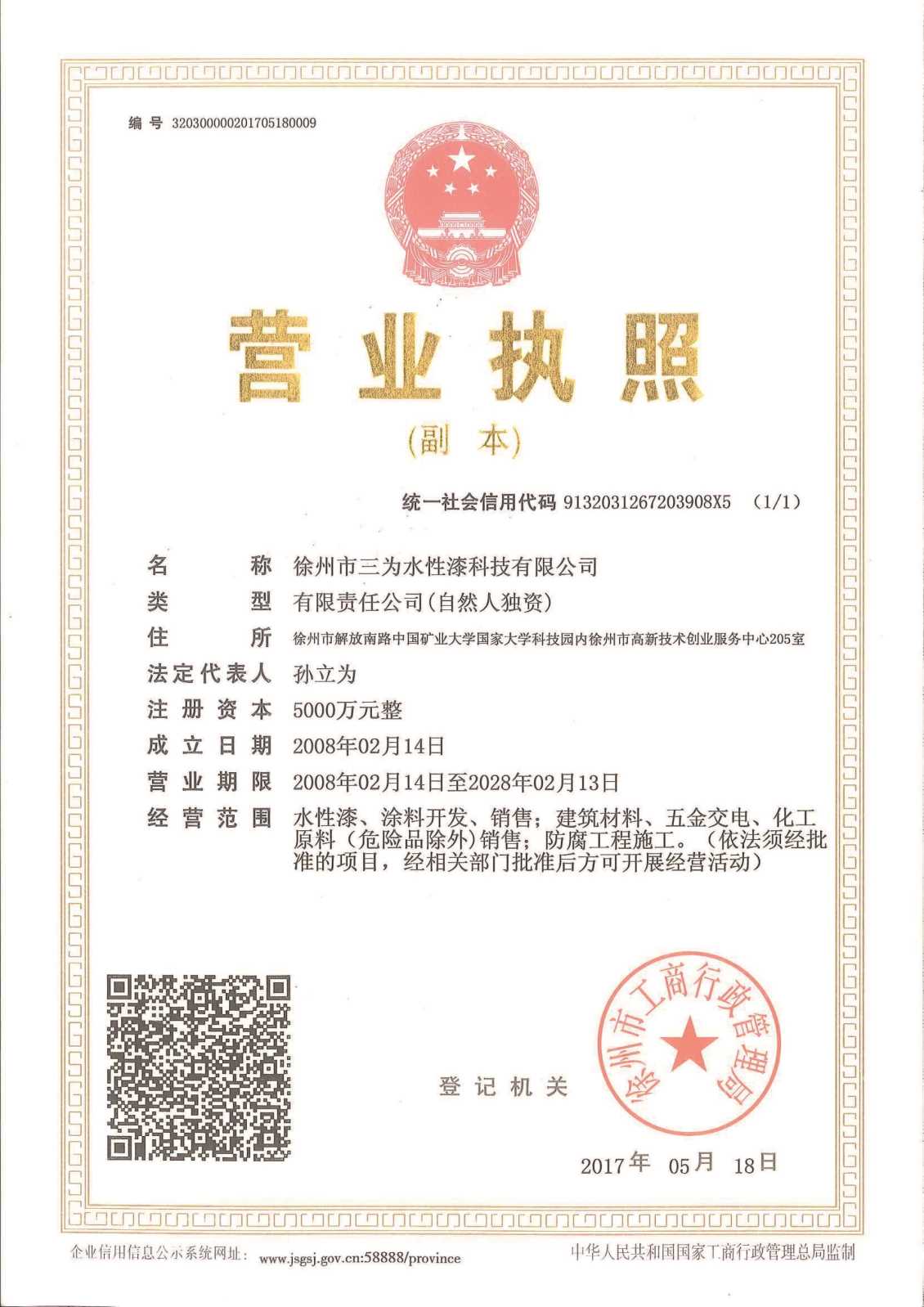 徐州市水性漆厂成立于1990年,产品自主研发填补国内水性工业空白。徐州市三为水性漆科技有限公司与中国矿业大学联合成立水性漆研发中心,从韩国尚庆大学引进国际纳米学者博士后姜继森教授为我公司技术总经理,专注水性纳米应用。三十余年来硕果累累,先后承接两 次 国 家 级 星火计划,中小企业技术创新基金,多项国家发明专利授权并在国家专利局“国际专利博览会”国际专利博览会中荣获创新奖与金奖,全国军民融合企业,《CCTV工匠精神》企业,国家生产力促进中心评为中国好技术,获“中国节能环保创业应用大赛”创新应用奖,中国企业诚信经营示范单位,江苏省民营科技企业,中船重工涂装专业委员会成员,《中国修船》编委,多次在 国 家 级 期刊发布学术论文,通过中国船级社检测,通过中国铁道部科学院检测。?